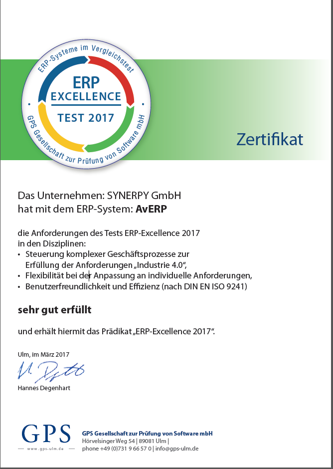 Die SYNERPY GmbH hat mit AvERP die Anforderungen des Tests "ERP-Excellence 2017" mit dem Ergebnis "sehr gut" erfüllt. Finden Sie weiterführende Informationen im Testbericht der Firma GPS aus Ulm.
